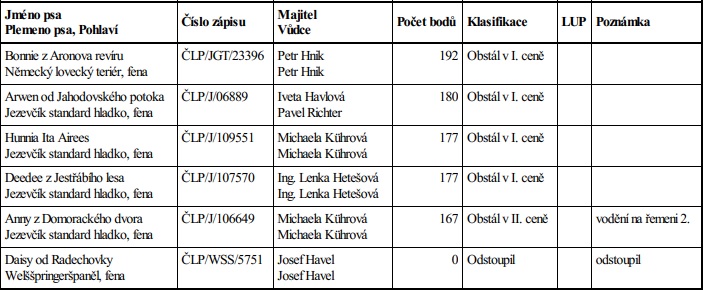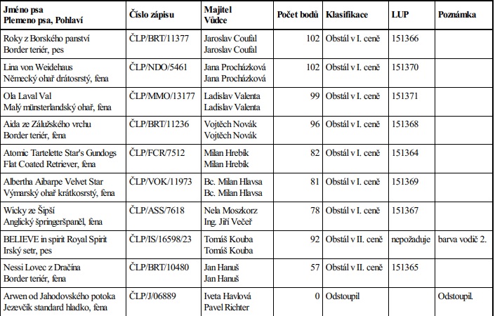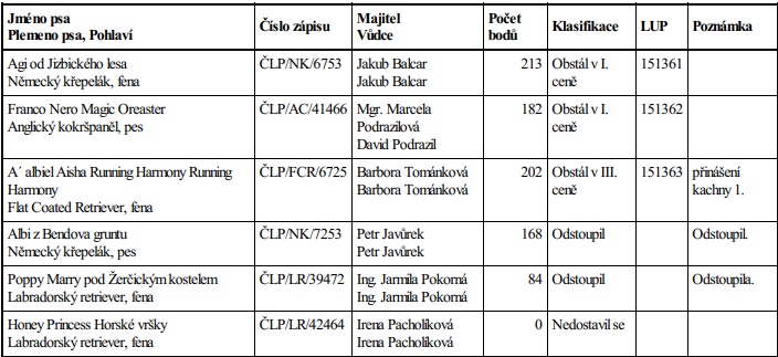 Přihlášeno bylo 22 vůdců, nastoupilo 22 a úspěšně dokončilo 16. Vítězem zkoušek se stal pes německého drátosrstého ohaře ARIN II z Plzínů s vůdcem Josefem Noskem, kteří získali 485bodů v I.ceně. Všem úspěšným srdečně gratulujeme. Těm co neuspěli přejeme více zkouškového štěstí na dalších kynologických akcích.